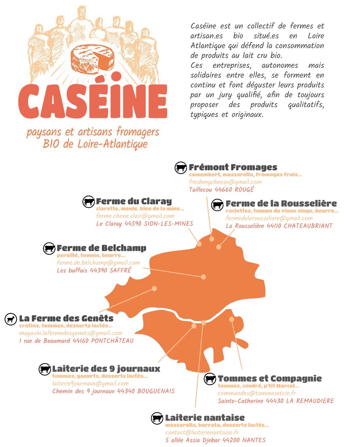 Aujourd’hui Caséine regroupe 8 fermes et artisan·nes sur la Loire Atlantique. Chaque ferme a ses spécificités et ses produits phares.