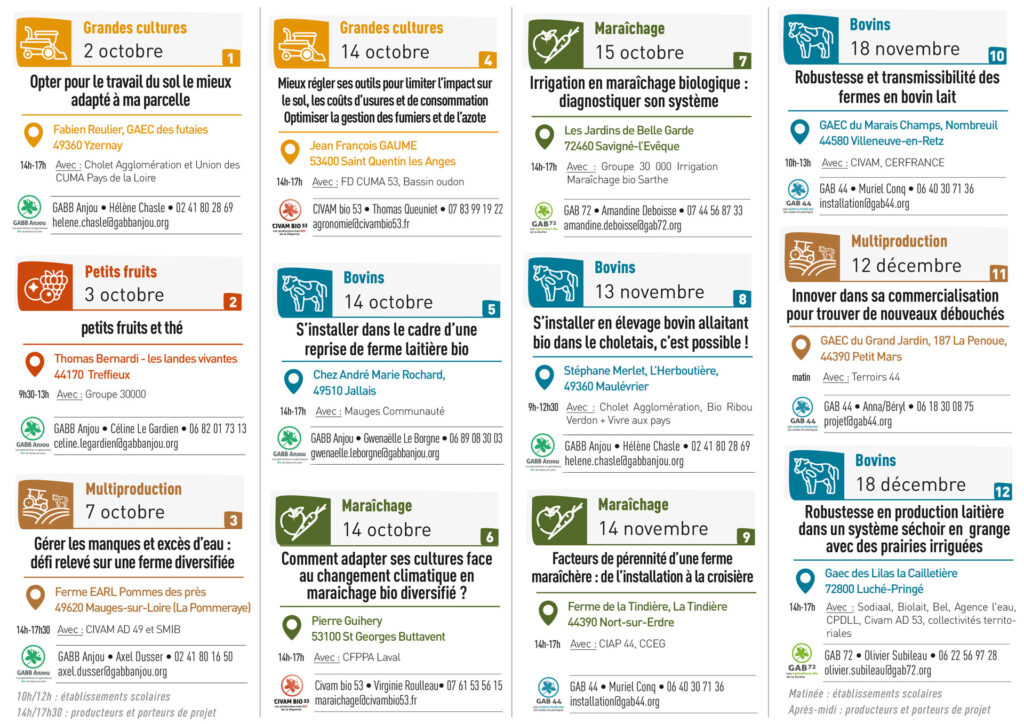 12 fermes ouvrent leur porte pour rencontrer des productrices et producteurs bio ou porteuses et porteurs de projet en élevage, en grandes cultures, en plantes médicinales et aromatiques et en fleurs comestibles. Ces fermes ouvertes permettent aussi de découvrir aux personnes en formation l’agriculture biologique.
