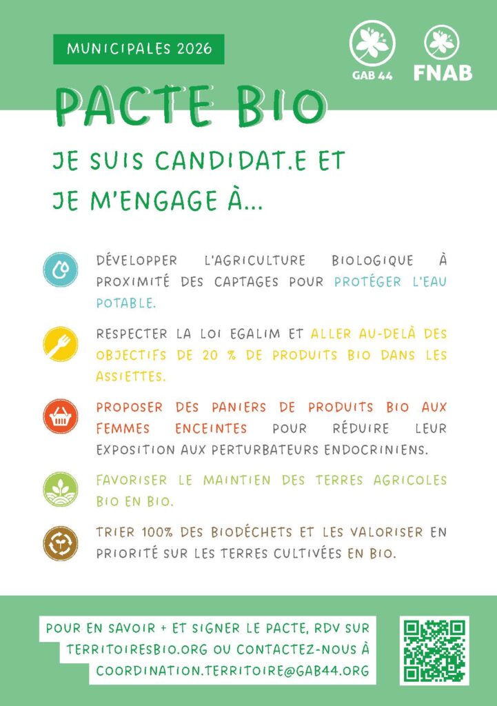 - Candidates, candidats, la FNAB (Fédération National pour l’Agriculture Bio) lance le Pacte Bio ! Vous êtes appelés à vous engager en faveur de l’agriculture biologique autour de 5 actions concrètes.